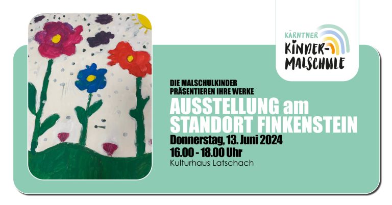 Die MALSCHULKINDER vom Standort FINKENSTEIN der Kärntner Kindermalschule laden ein! An allen 12 Standorten präsentieren die Malschulkinder am Ende des Frühjahrsemesters eine Auswahl ihrer Werke. Am Standort Finkenstein findet die Ausstellung an folgendem Termin statt: Donnerstag, 13. Juni 2024,16.00 –…