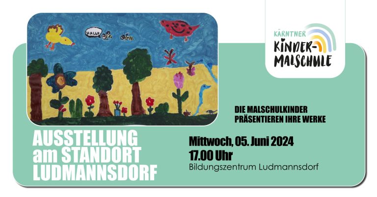 Die MALSCHULKINDER vom Standort LUDMANNSDORF der Kärntner Kindermalschule laden ein! An allen 12 Standorten präsentieren die Malschulkinder am Ende des Frühjahrsemesters eine Auswahl ihrer Werke. Am Standort Ludmannsdorf findet die Ausstellung an folgendem Termin statt: Mittwoch, 05. Juni, 17.00 UhrBildungszentrum…